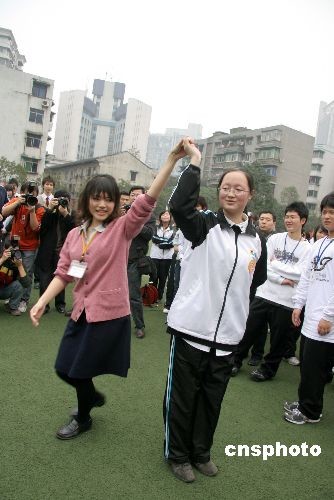 圖為現(xiàn)場(chǎng)兩位跳得最好的女高中生(右為中國(guó)女生)在校園里切蹉、展示“舞”藝,增進(jìn)友誼。