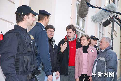 “對(duì)基地說不”組織負(fù)責(zé)人馬伊切克(右4) 向美國(guó)大使館交涉,聲稱要向美國(guó)政府送交伊朗戰(zhàn)爭(zhēng)物證。