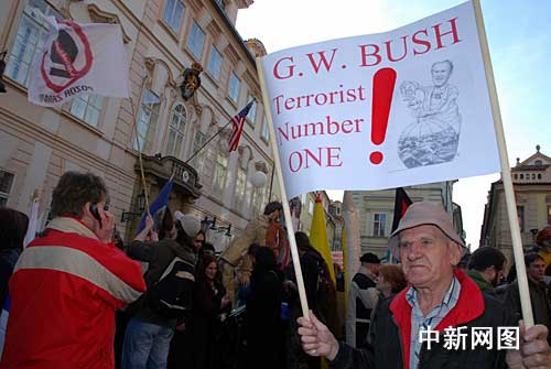一位示威者在美國大使館前面舉著“布什是頭號(hào)恐怖分子”的標(biāo)語牌。