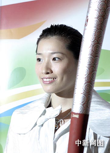北京奧運(yùn)會(huì)火炬希臘傳遞的第一位中國火炬手羅雪娟3月23日晚身著白色禮服出席晚宴,圖為其手持祥云火炬接受媒體拍照。中新社記者:王歡