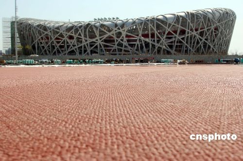 隨著北京奧運會腳步的逐漸臨近,奧運場館的建設也進入了最后的收尾階段。3月下旬,國家體育場“鳥巢”旁的熱身場地塑膠跑道已基本鋪設完成。中新社發(fā) 富田 攝