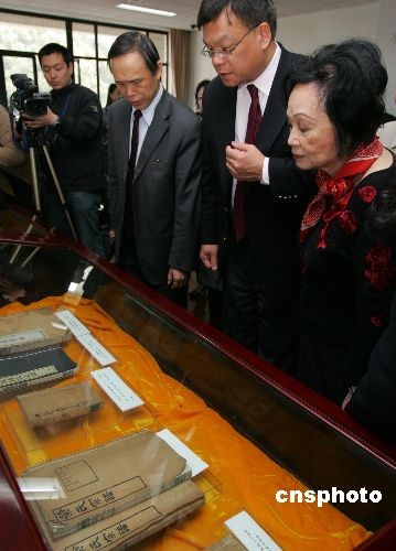 宋子文長女馮宋瓊頤(右)在其親屬的陪同下參觀了上海圖書館,并對目前館藏的眾多名人家譜產(chǎn)生了濃厚的興趣。中新社發(fā) 湯彥俊 攝