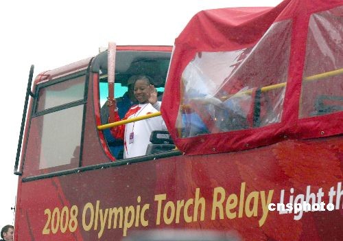 4月6日上午10時(shí)32分,倫敦大雪紛飛,獲得過五枚奧運(yùn)金牌的英國劃艇名將史蒂夫·瑞格夫手持祥云火炬穩(wěn)步跑出倫敦西北的溫布利體育場(chǎng),北京奧運(yùn)圣火傳遞“和諧之旅”第四站隨之吹響號(hào)角。倫敦是北京奧運(yùn)圣火境外傳遞過程中,傳遞路線最長、最復(fù)雜的城市。約八個(gè)半小時(shí)的圣火傳遞,包括了輪船、自行車、敞篷公共汽車、輕軌等四種特殊傳遞方式。圖為第二棒火炬手乘坐具有倫敦特色的紅色雙層巴士離開溫布利體育場(chǎng)。中新社發(fā) 沈晨 攝