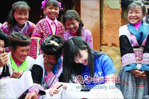 拿著當?shù)貗D女自己織的布,向她們討教如何蠟染和繡花,周慧敏和農(nóng)婦及當?shù)氐男」媚镉姓f有笑。