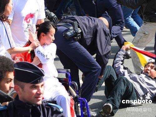 4月7日,奧運(yùn)火炬手金晶在北京奧運(yùn)會(huì)火炬接力巴黎站的傳遞活動(dòng)中奮力保護(hù)火炬。賈婷 攝