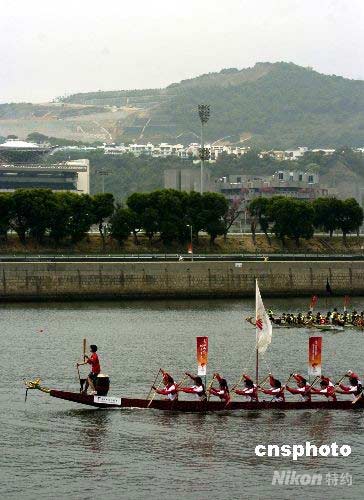 圖為一名火炬手乘坐龍舟橫渡城門(mén)河的情形。 譚達(dá)明 攝