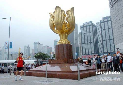 最后一名跑手手持模擬奧運火炬順利抵達終點站--金紫荊廣場。 鄧慶樂 攝