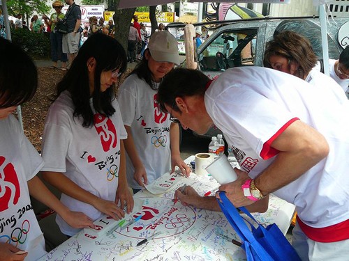 在現(xiàn)場擺設(shè)的“簽名支持北京奧運”攤位前,光臨這里的美國客人從開攤到收攤一直絡(luò)繹不絕。有許多美國朋友在聽留學生們講完關(guān)于“北京奧運對于中國人民的重大意義”, “北京奧運目前的籌備情況”等話題之后,當即表示,我們完全支持你們的北京舉辦這屆奧運會,我們不同意任何人提出的“抵制北京奧運”的任何理由。有幾位曾經(jīng)到過北京的美國人對他們的同伴介紹說:我門去過北京的,那是一個既古老又新興的漂亮城市,在北京舉辦奧運會,絕對是本屆奧運會的最佳選擇! 他們都十分肯定地在由中國留學生準備的簽名大橫幅上簽下了自己的名字。