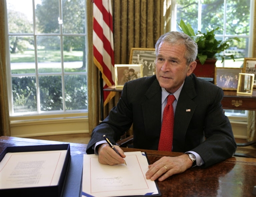 在去財(cái)政部探望了那里的工作人員,并鼓舞他們的士氣后,布什回到他白宮的橢圓形辦公室,簽署了這個(gè)史上規(guī)模最宏大的救市法案。他還特地邀請了各大媒體的攝影記者,記錄下這歷史一刻。