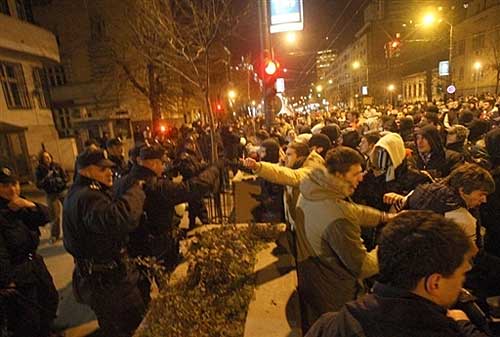 據(jù)聯(lián)合早報網(wǎng)報道,大約一千名憤怒的塞族青年,到美國大使館、一間美式快餐店和歐盟輪任主席國斯洛文尼亞大使館投擲石塊,并與防暴警察沖突,示威者又拆去歐盟旗幟,示威者又縱火、燒車,打爛大使館的玻璃窗。防暴警察以催激氣體及橡膠子彈驅散,又施放催淚氣體和出動警棍驅散。
