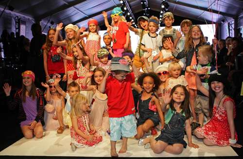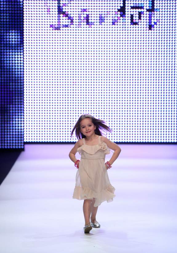 當(dāng)日,小模特在T臺上展示童裝為時裝周開幕。