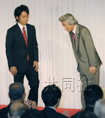 日本前首相小泉純一郎在演講會上向接班人次子進(jìn)次郎行禮。