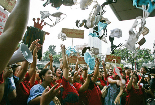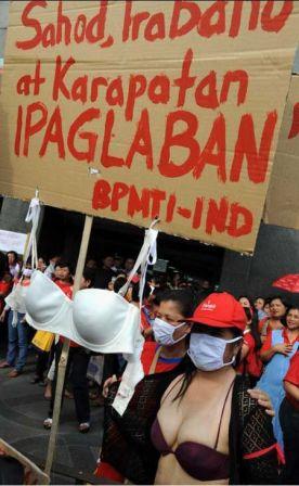 當日,數(shù)百名女工游行至該公司位于金融區(qū)馬卡蒂的倉庫示威,期間她們大拋女性內(nèi)衣褲,以示不滿。