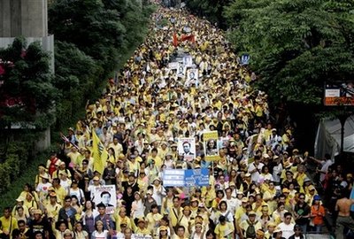 中新網(wǎng)10月31日電 據(jù)“中央社”報(bào)道,泰國(guó)擁政府派誓言10月31日展開(kāi)集會(huì),加上反政府的人民民主聯(lián)盟群眾30日凌晨遭手榴彈攻擊,社會(huì)對(duì)立的緊張氣氛高漲。分析認(rèn)為,緊張氣氛恐怕在11月1日前總理他信越洋聯(lián)機(jī)活動(dòng)當(dāng)天達(dá)高峰。