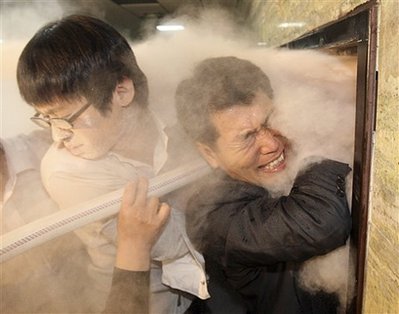 圖為韓國(guó)執(zhí)政黨議員使用滅火器阻止在野黨人士進(jìn)入會(huì)議室。