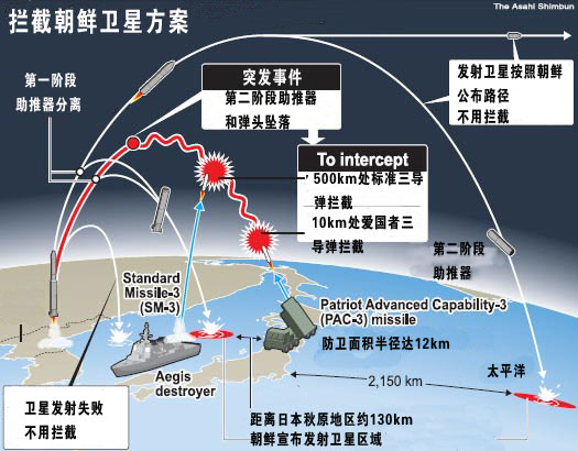 《朝日新聞》報(bào)道稱,日本已經(jīng)分別在驅(qū)逐艦上布署了;汀皹(biāo)準(zhǔn)三型(SM3)”防空導(dǎo)彈和陸基型“愛國者三型(P3C)”地對(duì)空導(dǎo)彈。在裝備有“宙斯盾”作戰(zhàn)系統(tǒng)的驅(qū)逐艦上部署了;汀皹(biāo)準(zhǔn)三型(SM3)”防空飛彈,這種飛彈采用熱導(dǎo)技術(shù)探測(cè)目標(biāo),可以在目標(biāo)的預(yù)定軌道上等待。一旦發(fā)現(xiàn)可疑目標(biāo),便將其擊落。如果;鶚(biāo)準(zhǔn)三型飛彈攔截行動(dòng)失敗,雷達(dá)將引導(dǎo)陸基愛國者三型導(dǎo)彈實(shí)施第二次攔截,擊落目標(biāo)。