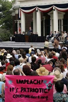 據(jù)香港《文匯報(bào)》等媒體報(bào)道,布什在第3任總統(tǒng)兼《獨(dú)立宣言》起草人杰斐遜在弗州夏洛茨維爾的故居發(fā)表為時(shí)僅有10分鐘的演說,期間至少9名示威者被押送離開。有示威者呼喊“彈劾布什!”又有示威者罵他“戰(zhàn)犯”。