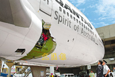 據(jù)香港《文匯報(bào)》報(bào)道,這架澳航QF30客機(jī),25日晨9時(shí)由香港起飛,原定當(dāng)?shù)貢r(shí)間晚上約10時(shí)飛抵墨爾本,但在起飛約1小時(shí)后,機(jī)身近右邊機(jī)翼部分突然傳出巨響,機(jī)師決定緊急降落馬尼拉,11時(shí)左右安全著陸后,機(jī)上346名乘客和19名機(jī)組人員無(wú)人受傷。