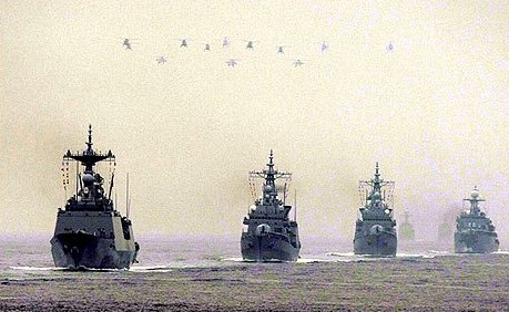 由50余艘軍艦和30余架飛機參加的海上閱兵儀式十分壯觀。