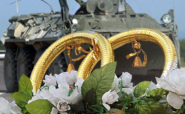 由一輛貨真價(jià)實(shí)的裝甲運(yùn)兵車引導(dǎo)的婚禮車隊(duì)沿著列寧大街飛馳。龐大的裝甲運(yùn)兵車裝飾著彩帶、蝴蝶結(jié)和一塊寫著“新郎哥們”的牌子。盡管在由外國(guó)品牌轎車組成的車隊(duì)中顯得有些別扭,但的確吸引了路人的眼球。