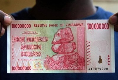 這是津巴布韋今年內第29次靠發(fā)新鈔來追趕通貨膨脹和舒緩貨幣短缺問題。津巴布韋剛在上周四發(fā)行面值1億津巴布韋元的鈔票,當時的實值是14美元;可是一星期后,兌換率只有0.5美元。