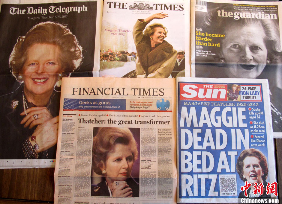 英國各大媒體頭版報道撒切爾夫人去世消息