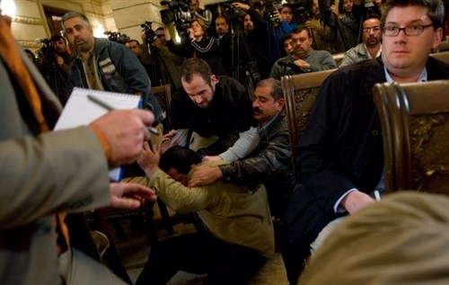 不過,塔拉巴尼的話似乎并不能代表全體伊拉克人民的真實(shí)感受。在與馬利基的聯(lián)合發(fā)布會(huì)上,布什講話時(shí),一名伊拉克記者將兩只鞋朝布什扔了過去,并高聲辱罵:“這是伊拉克人民給你的告別之吻!”好在布什身手敏捷,彎腰躲過了襲擊。隨后,馬利基英雄救“美”,用身體擋住了這位美國客人,而那個(gè)丟鞋的男子也被保安制服。