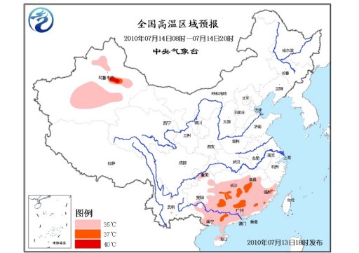 中新網(wǎng)7月13日電 中央氣象臺7月13日18時繼續(xù)發(fā)布高溫藍(lán)色預(yù)警:預(yù)計,明天白天,重慶南部、貴州東部、湖南中南部、江西中南部、福建大部、廣東大部、廣西大部、海南北部、臺灣西北部等地有35℃以上高溫天氣,局地溫度將達(dá)37~38℃。