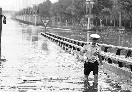 在金水路京廣鐵路立交橋下,記者看到,積水已完全淹沒地下通道,人行道和慢車道都是水,記者拿根木條試了試,水深大概1.5米。執(zhí)勤交警稱,從7時(shí)至8時(shí)30分,因積水太深,該路段交通雙向斷行1個(gè)半小時(shí),直至13時(shí),金水路金橋賓館附近交通才恢復(fù)正常。
