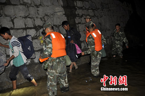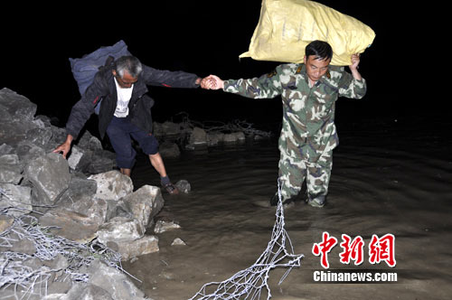 時間在一分一秒的過去,廖軍支隊長果斷下令,全體救援官兵穿著救生衣深入事故地段排成一條直線,由推土機的反斗將被困群眾載運到臨時通道的安全地帶,隨即救援官兵通過攙扶、背負、肩扛等方式將被困群眾引導(dǎo)到河水上游的安全處。