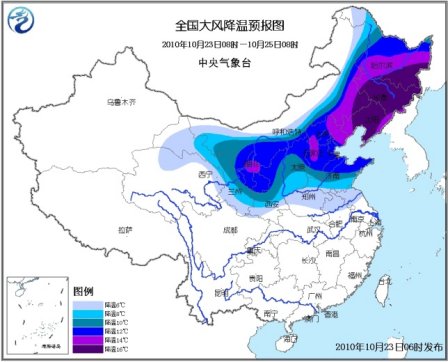 根據(jù)這份寒潮藍(lán)色預(yù)警,預(yù)計,10月23日08時至25日08時,內(nèi)蒙古大部、東北、甘肅大部、西北地區(qū)東部、華北、黃淮、江淮北部等地將出現(xiàn)6~12℃降溫,其中,寧夏中部、河北西部和東北部、內(nèi)蒙古東南部、東北大部等地的部分地區(qū)降溫幅度可達(dá)14~16℃;上述大部地區(qū)有4~6級偏北風(fēng)。