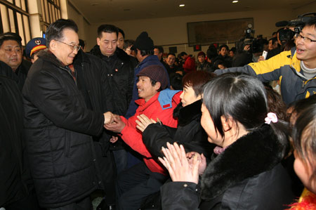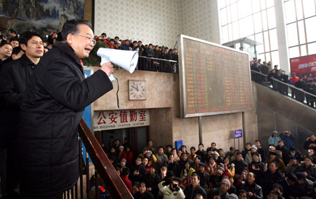 溫家寶還來到長沙火車站看望滯留車站的乘客。他動(dòng)情地說:“對(duì)大家滯留在這里,我向大家表示歉意,我們正在抓緊搶修,首先是搶修電網(wǎng),電網(wǎng)通了以后,火車就會(huì)通了,不需要很多的時(shí)間,大家就可以回家過年。春節(jié)快到了,我給大家拜個(gè)早年,謝謝大家!”