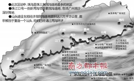 李珠江在昨日的新聞發(fā)布會上表示,新一輪的大發(fā)展,就是要加快建設粵東、粵西、珠三角三個海洋經(jīng)濟帶,大力發(fā)展能源、石化、鋼鐵和造船四個產(chǎn)業(yè)群,推動扶持30個重大項目建設投產(chǎn)。新獲批的《區(qū)劃》劃定了146平方公里的圍海造地區(qū),相當于5.5個澳門,最大限度地支持沿海地區(qū)的重大項目用海!秴^(qū)劃》中劃定了24個圍海造地區(qū),重點圍海造地區(qū)有10個(見上圖)。