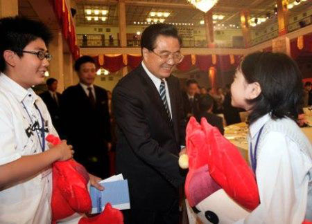 2007年6月19日,胡錦濤主席在北京人民大會(huì)堂出席“中日青年世代友好聯(lián)誼晚會(huì)”時(shí),日本訪問團(tuán)中年齡最小的成員橫堀由、大木博來(lái)到胡錦濤面前,請(qǐng)胡主席為他們簽名。胡錦濤高興地對(duì)他們說,從你們身上,我看到了中日友好事業(yè)的希望。他將兩個(gè)北京奧運(yùn)會(huì)的吉祥物“福娃”贈(zèng)送給他們。兩位日本少年臉上露出喜悅的笑容。
