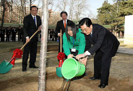 春天是播種希望的季節(jié)。胡錦濤專門來(lái)到中國(guó)人民大學(xué)百家園,同中日青少年代表一起種植友誼樹。