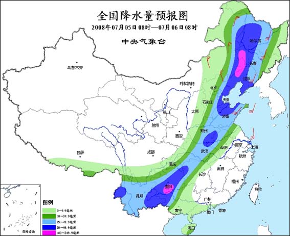 7月5日08時至7月6日08時,西藏南部和東部、甘肅東南部、陜西大部、內蒙古中東部、東北大部、華北、黃淮、江淮大部、江漢、湖南西部和北部、西南地區(qū)、廣西中西部、廣東西南部沿海、海南等地有小到中雨或雷陣雨,其中,內蒙古東部、東北中西部、華北東部、黃淮大部、江漢地區(qū)大部、湖南西北部、重慶東部和南部、四川南部、貴州大部、云南大部、廣西西部等地有大到暴雨,局地有大暴雨,上述部分地區(qū)并伴有短時雷雨大風或冰雹等強對流天氣。內蒙古東北部、東北地區(qū)有4~5級偏南或偏北風,渤海、黃海、東海北部有5~6級偏南風。