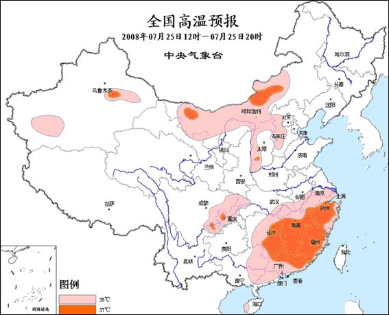 中新網(wǎng)7月25日電 中央氣象臺2008年7月25日10時發(fā)布高溫預(yù)報(bào):預(yù)計(jì)今天白天,江淮南部、江南大部、華南中東部、四川盆地東部、重慶大部以及新疆吐魯番盆地、內(nèi)蒙古中西部、山西西部和北部、河北西部等地將有35℃以上的高溫天氣.