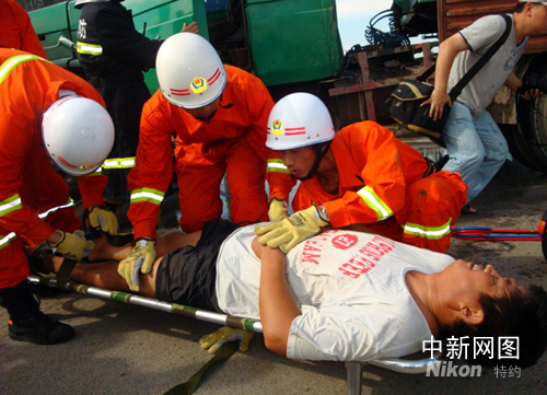 大橋消防中隊(duì)接到報(bào)警后,立即出動(dòng)三輛消防車(chē)15名消防官兵趕赴出事地點(diǎn)。8時(shí)36分到達(dá)事故現(xiàn)場(chǎng),此時(shí),空氣中彌漫著濃濃的柴油、機(jī)油味道,發(fā)動(dòng)機(jī)處還向外冒著黑煙。指揮員迅速展開(kāi)災(zāi)情偵察,組織搶險(xiǎn)車(chē)人員利用液壓破拆器材解救被困人員,A類(lèi)泡沫車(chē)人員出兩支泡沫槍滅火掩護(hù),重型水罐泡沫車(chē)組織供水。動(dòng)作迅速,操作熟練的消防官兵只用了5分鐘的時(shí)間就成功將駕駛員救出,并在第一時(shí)間抬上救護(hù)車(chē)送往醫(yī)院。