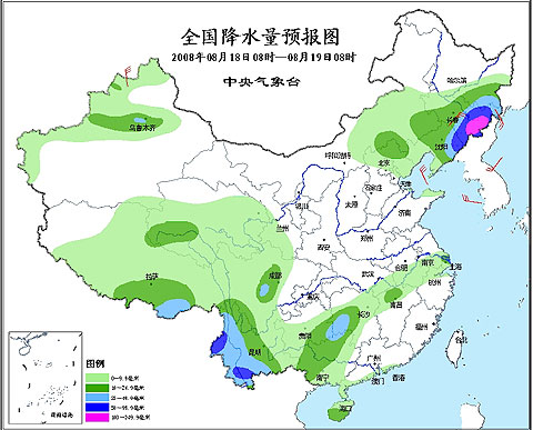 2008年8月18日08時(shí)—8月19日08時(shí) 全國(guó)降水量預(yù)報(bào)圖
