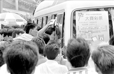 集中銷售彩票的模式開展起來。當時,福彩、體彩的人拉著電視機、洗衣機、自行車等,到農村的集市或者城市的廣場上售賣。人們管這種彩票叫“刮獎”,買到后,只需用指甲刮開,便知道自己是中了自行車、洗衣機,還是一無所獲。