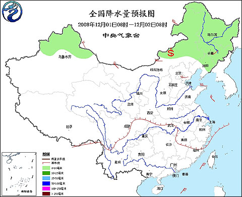 2008年12月1日8時(shí)—12月2日8時(shí)全國(guó)降水量預(yù)報(bào)圖