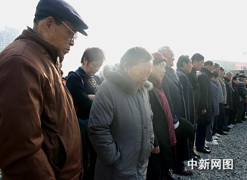 冬日的南京顯得陰冷。早上十時,警報聲中,聚集在紀(jì)念館悼念廣場的三千軍民低首默哀三分鐘,并向遇難同胞三鞠躬。