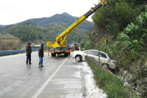 當記者到現(xiàn)場時,交警正在緊張地指揮吊車對滑到路基外的轎車進行施救!耙呀(jīng)有4輛車子沖出路基了!币晦I車司機回憶,當時他從瞻岐往寧波市區(qū)方向開,剛好下坡,到了彎道,他感覺車輪打滑,下意識一踩剎車,車子就失控滑向?qū)ο蜍嚨,甩?80度后,車尾滑出路基才停了下來。就在他下車報警沒多久,又有一輛車步他后塵,滑出了路基。