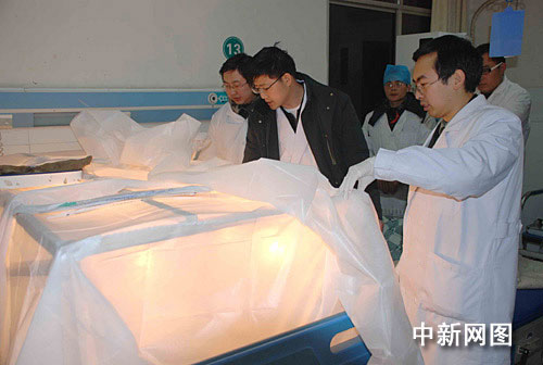 圖為第三軍醫(yī)大學(xué)重慶西南醫(yī)院燒傷專家26日晚在城口縣人民醫(yī)院查看噴爐事故傷者情況。作者:樊官勇