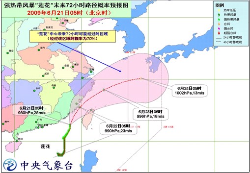 預(yù)計,“蓮花”將以每小時15公里左右的速度向北偏東方向移動,逐漸向福建福清到漳浦一帶沿?拷,有可能于今天下午到夜間在這一帶沿海登陸;也有可能擦過福建省近海海面,沿臺灣海峽向東北方向移動,強度逐漸減弱。