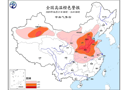 中新網(wǎng)6月25日電 據(jù)中國氣象局網(wǎng)站消息,中央氣象臺今天早晨六點鐘繼續(xù)發(fā)布高溫橙色警報:預(yù)計,今天白天,華北大部、黃淮、江淮、江漢、江南北部及陜西大部、寧夏中北部、甘肅北部、內(nèi)蒙古中西部和新疆南疆盆地有35℃以上的高溫,其中,河北大部、京津、山西大部、山東大部、陜西東部、河南、安徽中北部、江蘇西北部及南疆盆地東部等地最高氣溫可達37~39℃,河北中南部、京津南部、河南中北部、山西南部、山東西部及南疆盆地東部等地局部氣溫可達40℃。