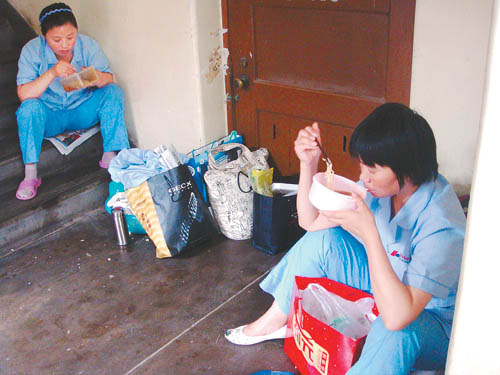 兩名護(hù)工在醫(yī)院走廊里解決晚餐。護(hù)工24小時(shí)陪在病人身邊,每天中午和傍晚兩個(gè)時(shí)段,分別可以抽出40分鐘解決吃飯問題,只有這一刻,是屬于他們自己的時(shí)間。