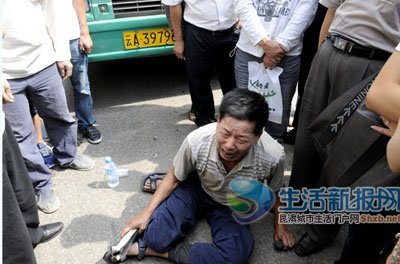 一名50多歲的男子擋在一輛77路公交車前,坐在地上痛哭,民警怎么勸說(shuō)他也不愿意離開(kāi)。男子稱:“這些城管太不講道理了,他們快把我的兒子打死了!睋(jù)該男子介紹,20多名城管人員昨日早上將其兒子打傷,兒子被送進(jìn)醫(yī)院搶救,而打人的城管全部跑了,“實(shí)在是沒(méi)有辦法,我兒子不能白白受罪,無(wú)奈之下,我只能通過(guò)這種方法引起相關(guān)部門的重視!
