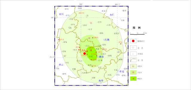 Ⅶ度區(qū)分布在姚安與大姚縣境內(nèi),北自大姚縣金碧鎮(zhèn)大橋村以北,南到姚安縣彌興鎮(zhèn)中村,東起姚安縣前場(chǎng)鎮(zhèn)莊科村西部,西到祥云縣東山鄉(xiāng)新民村,面積約883平方千米。