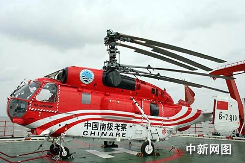 在“雪龍”號船尾的停機坪上,記者見到了中國南極考察首架自備卡-32直升飛機。由于在航行過程中需要存放在船上的機庫中,所以飛機螺旋槳的旋翼還未展開。船員告訴記者,該型直升機吊掛能力可達4噸,是以前船載機型的4倍左右,成為南極地區(qū)目前使用的最大噸位直升機。它可直接進行船岸之間來回運輸,更好地滿足南極新老三座考察基地的物資保障需求。另外,“雪龍”號此次科考任務同樣將配備兩架直升飛機,除了該架自備卡-32外,另外一架從國外租借的直升飛機將在新西蘭上船。